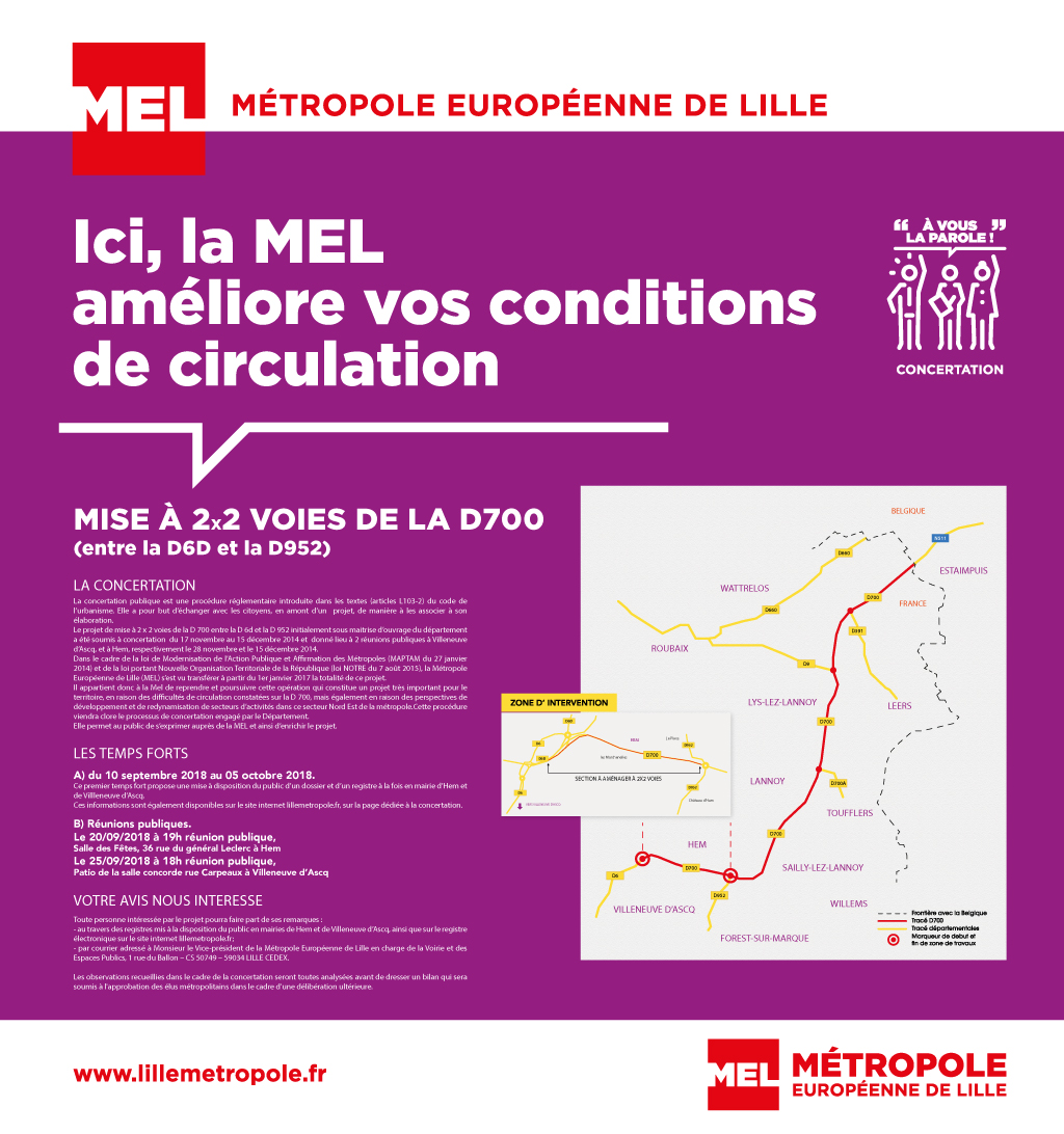 Depuis le 10 septembre, la concertation préalable pour la mise à 2*2 voies de la RD 700 est relancée par la Métropole Européenne de Lille, désormais compétente pour l’aménagement de cette route départementale. Depuis des années, la ville de Hem et de nombreux élus du secteur se mobilisent pour que cette voie entre Hem et Villeneuve d’Ascq ainsi que le rond-point dit Kiabi soient réaménagés pour rendre la circulation plus fluide et sécurisée, notamment aux heures de pointe.