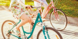 The two young girls with bicycles in park