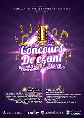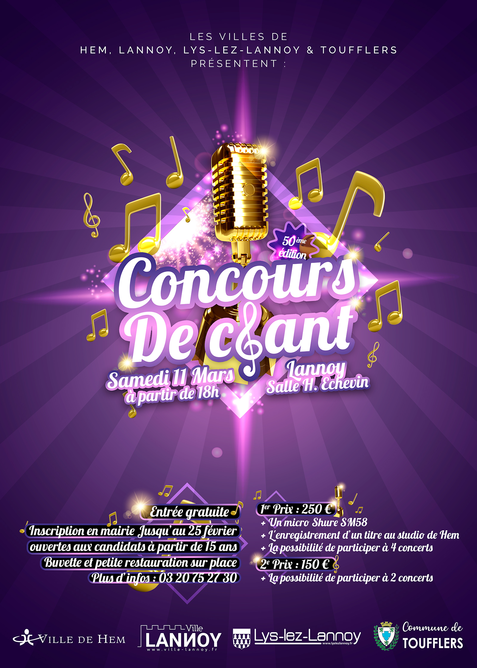 Les villes de Hem, Lannoy, Lys-Lez-Lannoy et Toufflers organisent la 50e édition du concours de chant intercommunal. Vous avez 15 ans ou plus, vous vous rêvez dans « The Voice » et vous avez un joli timbre de voix ? N’hésitez pas à vous inscrire avant le 25 février