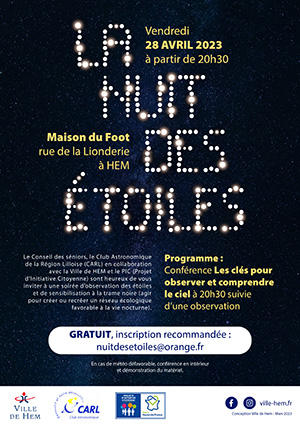 Vendredi 28 avril, rendez-vous à la Maison du Foot, rue de la Lionderie, pour la Nuit des Étoiles. Venez en savoir plus sur les astres qui tapissent le ciel à des millions de kilomètres de la terre.