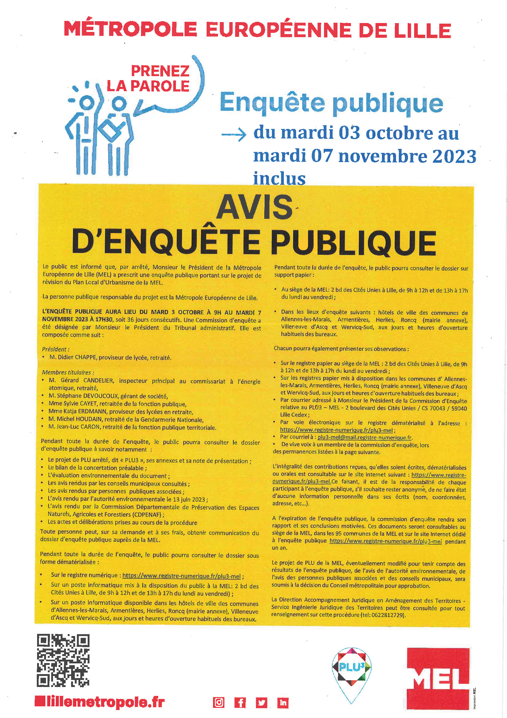 Une Enquête publique sur la révision générale du Plan Local d’Urbanisme de la MEL (PLU3) aura lieu du 3 octobre, 9h au 7 novembre 2023, 17h30.