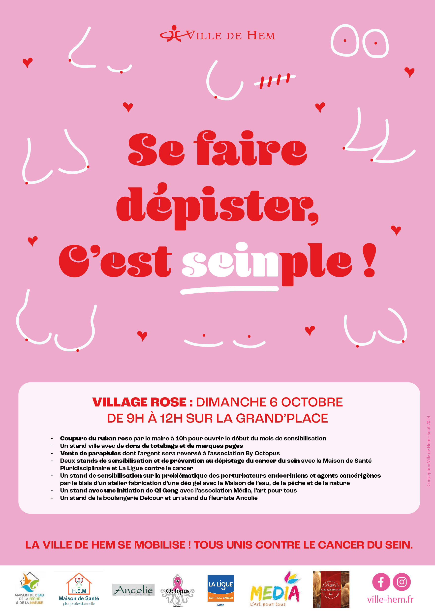 Le coup d’envoi de cette semaine spéciale sera donné le dimanche 6 octobre de 9h à 12h sur la Grand place de Hem. Le point culminant de la journée sera la coupure symbolique du ruban rose à 10h par Monsieur le maire, marquant le début des festivités et des actions de sensibilisation. Le village d’Octobre Rose sera animé par divers stands de prévention et d’information, incluant un stand pour la maison de la santé (conseils médicaux et dépistages), un stand avec la ligue contre le cancer ou encore des stands avec des commerçants hémois. Cette matinée sera l’occasion pour les habitants de s’informer, de se faire dépister et de participer à des activités de bien-être tout en soutenant une cause vitale.