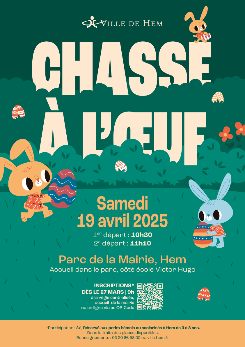 À l’approche de Pâques, les petits Hémois sont invités à une chasse aux œufs laissés par les cloches dans le parc de la mairie. En récompense de leur récolte, les enfants de 3 à 8 ans recevront des friandises et les plus chanceux qui trouveront les quelques œufs en or remporteront une surprise exceptionnelle ! Alors n’oubliez pas de vous inscrire !