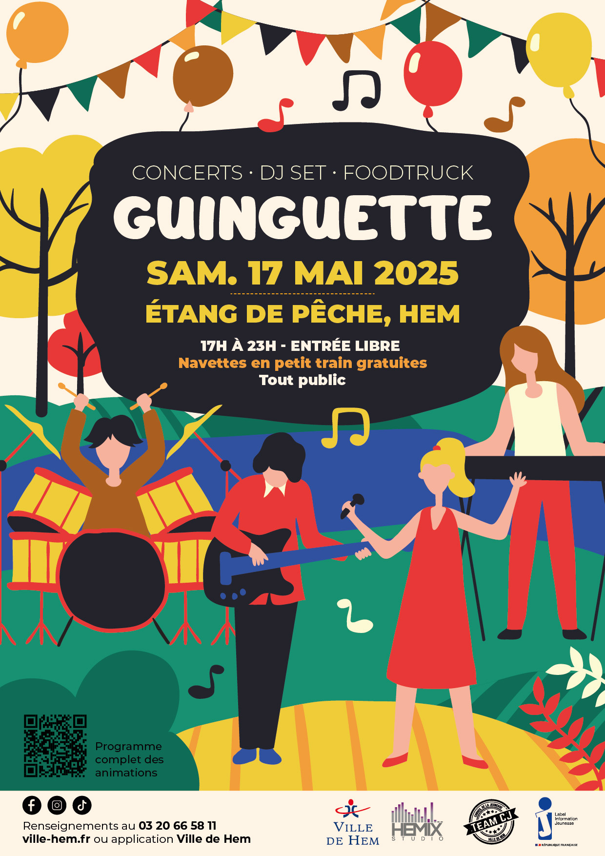 Samedi 17 mai, la base de loisirs et son étang prendront des airs de bord de Marne à l’occasion de la Guinguette de Hem. Dans un cadre verdoyant, concerts et animations se succèderont pour toute la famille, avec les prestations d’un accordéoniste. L’école municipale de musique vous proposera également un concert puis un DJ set sous les guirlandes d’ampoules !