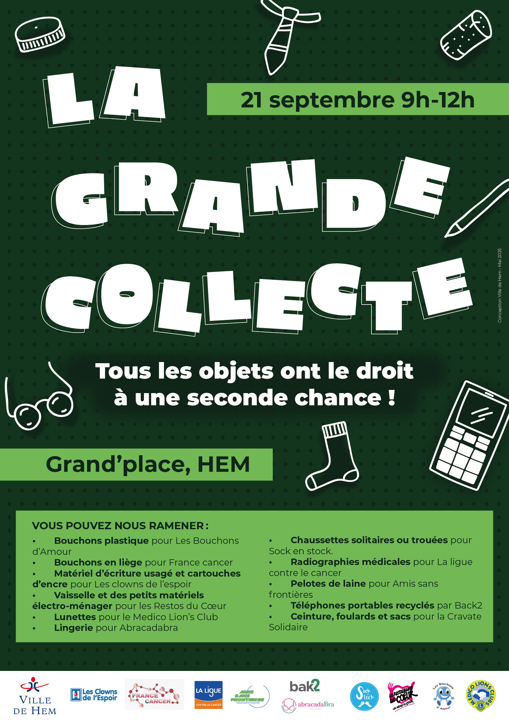 Dimanche 21 septembre, de 9h à 12h, en marge du marché, la Ville de Hem vous donne rendez-vous pour une Grande Collecte solidaire et écoresponsable. Le moment idéal pour faire du tri, alléger vos placards et agir concrètement en faveur de l’environnement et de la solidarité. Dans le cadre du défi “Zéro déchet”, plusieurs associations et structures seront présentes pour récolter vos objets usagés, les recycler, les réutiliser ou les redistribuer à ceux qui en ont besoin. L’idée ? Donner une seconde vie à ce qui dort chez vous, plutôt que de jeter ! Vous pourrez déposer : bouchons, vaiselle, lunettes, chaussures… (pour la liste complète, rendez-vous sur ville-hem.fr). Un petit geste pour vous, un grand pas pour la planète… et pour ceux qui en ont besoin. Alors, prêts à relever le défi du tri ?