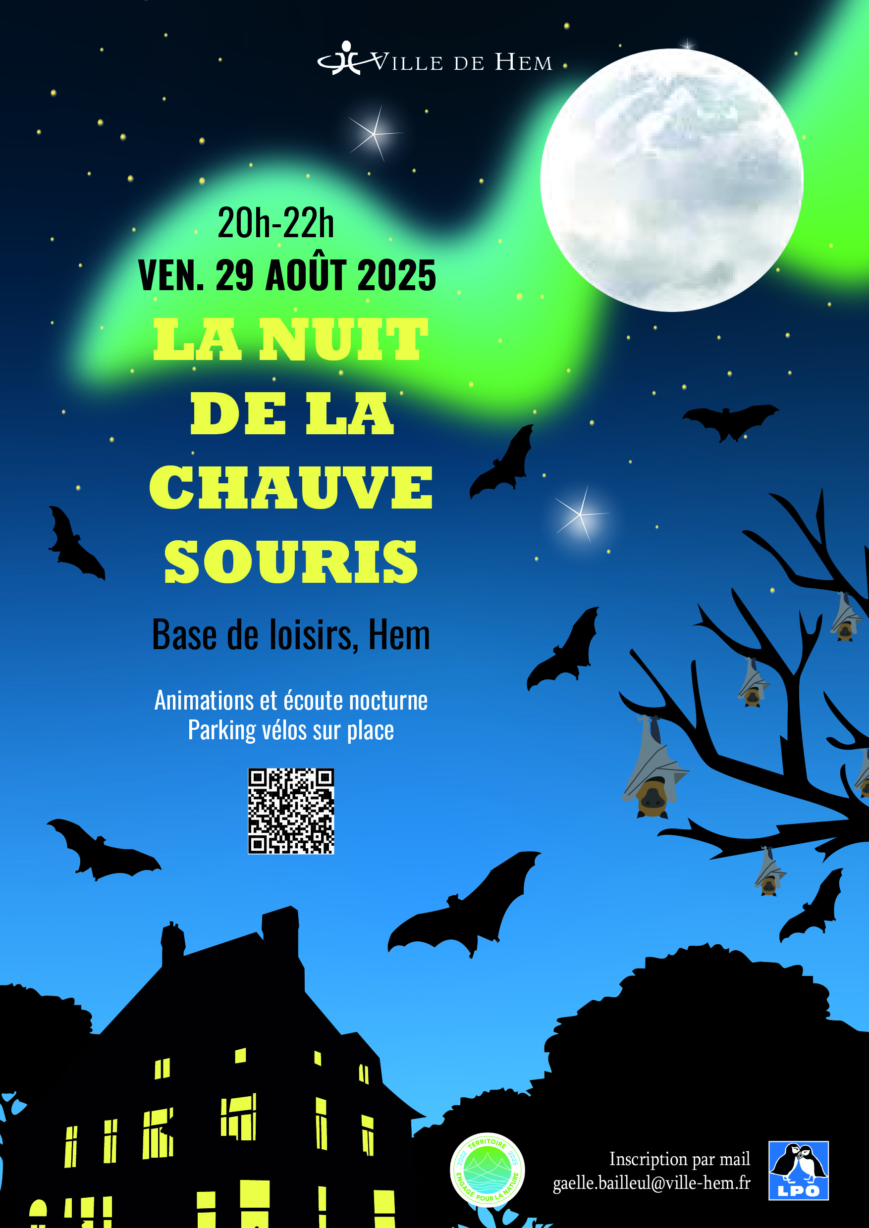Vendredi 29 août prochain, venez participer à l’animation la Nuit de la chauve-souris, de 20h à 22h. Organisée par la Ligue de Protection des Oiseaux, à la base de loisirs, avenue Delecroix à Hem (garage vélos disponible). Prévoir une tenue adaptée à la météo du jour.