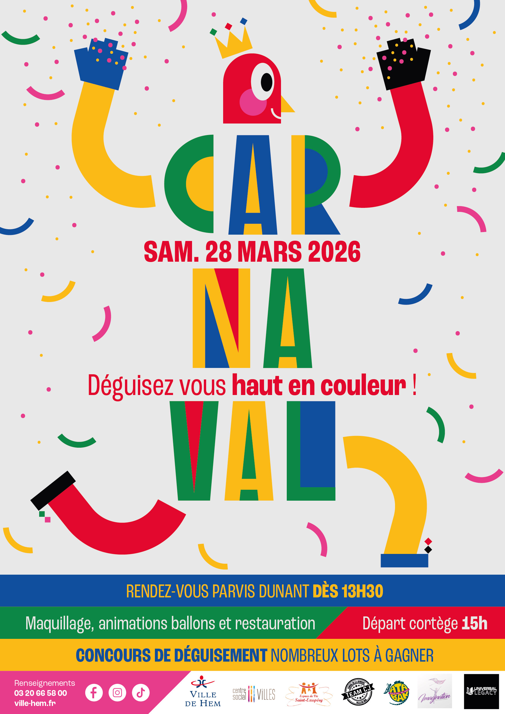 Point météo du samedi 28 mars, une tempête de confettis devrait s’abattre sur Hem, pour le plus grand plaisir des « carnavaleux ». En effet, le carnaval de Hem s’élancera ce jour du mail Dunant pour un joyeux défilé coloré et musical à travers la ville ! Le seul thème imposé cette année est celui de la couleur, vous pouvez laisser libre cours à votre imagination, que l’on sait sans limite ! Comme dans la chanson de la Compagnie Créole  : « Derrière mon loup, je fais ce qui me plaît. Aujourd’hui, tout est permis. » Alors, plutôt super héros, spationaute, princesse ou pirate ? Les paris sont ouverts. Et comme c’est toujours plus sympa quand les costumes sont faits main, des ateliers de préparation seront mis en place quelques jours avant le défilé à la salle Dunant. Bonus : les plus beaux déguisements seront récompensés par un petit cadeau. Comme à l’accoutumée, les associations hémoises seront de la partie pour le joyeux charivari musical et coloré. Alors ? On vous voit dans le cortège  ?