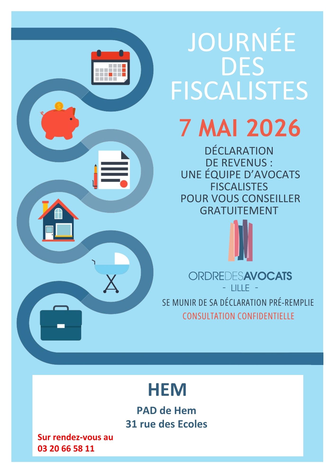 Jeudi 7 mai, des avocats fiscalistes seront présents au Point d’Accès au Droit, 31 rue des écoles, pour vous conseiller gratuitement sur votre déclaration de revenus.