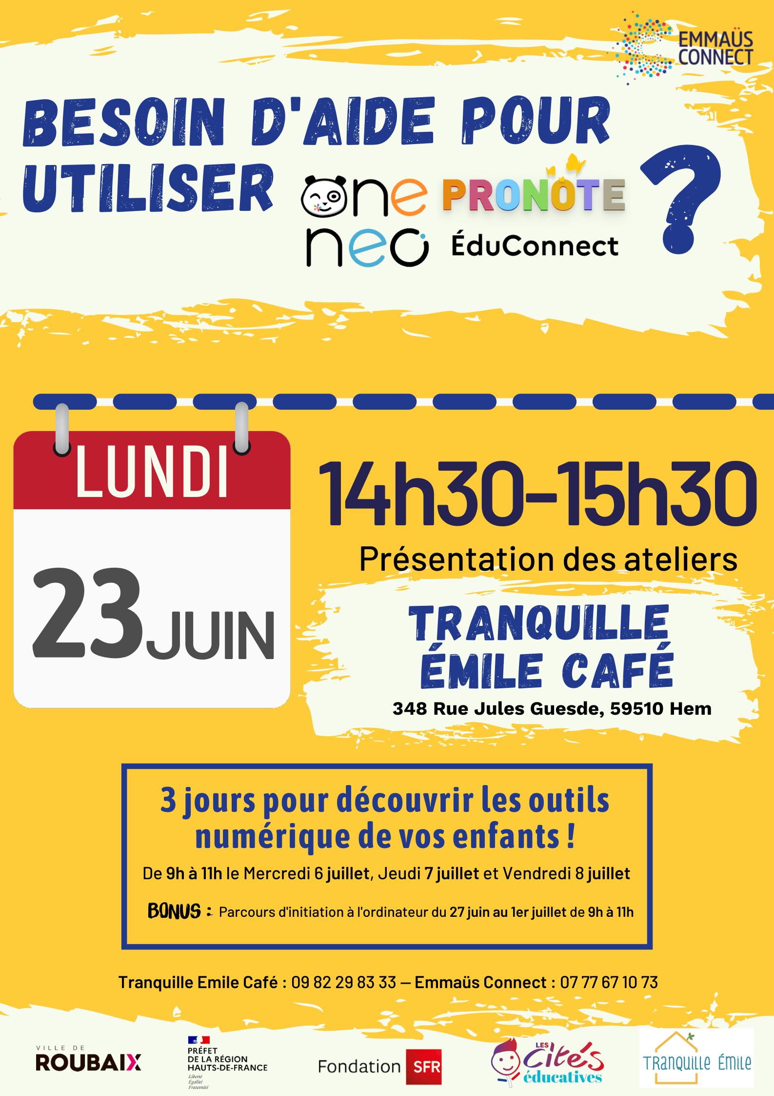 Une réunion d’information est proposée aux parents pour découvrir ces ateliers lundi 23 juin de 14h30 à 15h30 chez Tranquille Emile Café, 348 rue Jules Guesde