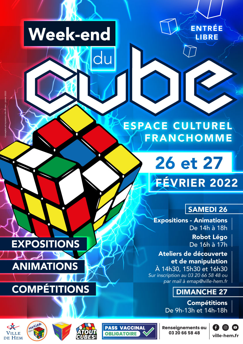 Organisé par la Ville de Hem et l’association MariCubik, le week-end du cube vous permettra de (re)découvrir le Rubik’s Cube au travers d’une exposition. Rencontrez également des joueurs qui vous donneront les astuces pour enfin résoudre ce casse-tête. Une animation Robot Lego est également prévue. Des ateliers de manipulation et de découverte sont également proposés (sur inscription). Dimanche 27 février, place à la compétition toute la journée. Venez assister aux rencontres et encourager les « cubeurs » !