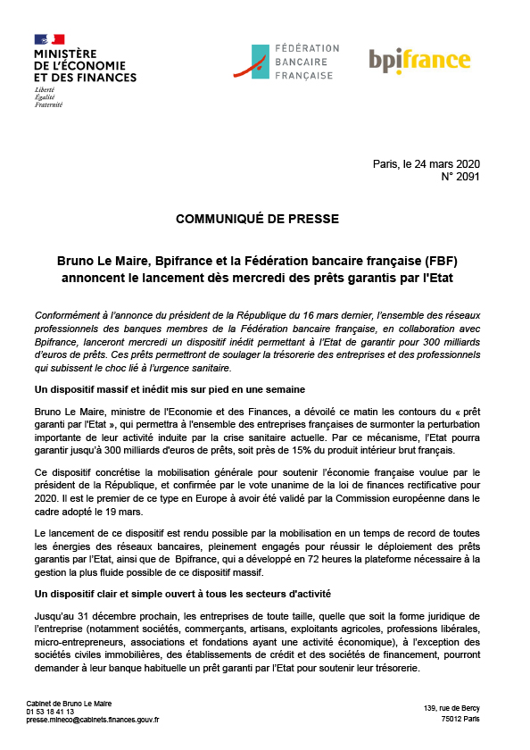 Bruno Le Maire, Bpifrance et la Fédération bancaire française (FBF) annoncent le lancement dès mercredi des prêts garantis par l’Etat.