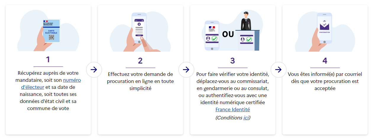 Un électeur absent le jour d’une élection (départementales, régionales, législatives, présidentielle, municipales…) ou d’un référendum peut voter par procuration. L’électeur absent choisit une personne qui vote à sa place. Cette personne doit voter selon les consignes données par l’électeur absent. L’électeur absent le jour de l’élection ou du référendum doit faire établir la procuration au plus tôt.